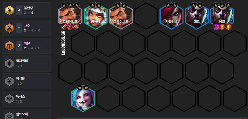 5레벨에 그레이브즈 3성작을, 이후 6레벨을 스킵하고 7레벨로 넘어가서 모든 기물 3성작을 해주시면 됩니다.