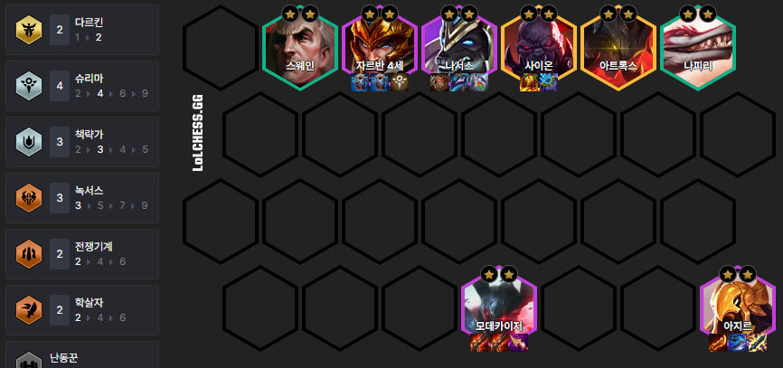 2슈리마인 경우, 아지르와 나서스의 아이템 개수가 같으면 나중에 필드에 올라간 기물이 초월합니다. -> 딜이 모자라면 아지르를, 탱이 모자라면 나서스를 필드에서 내렸다가 올려주시면 됩니다.