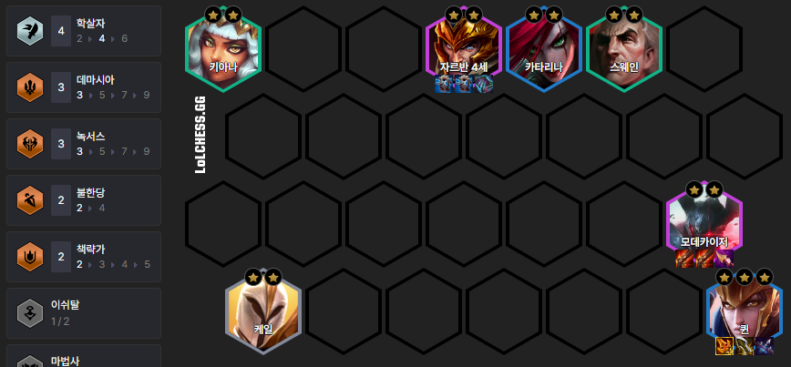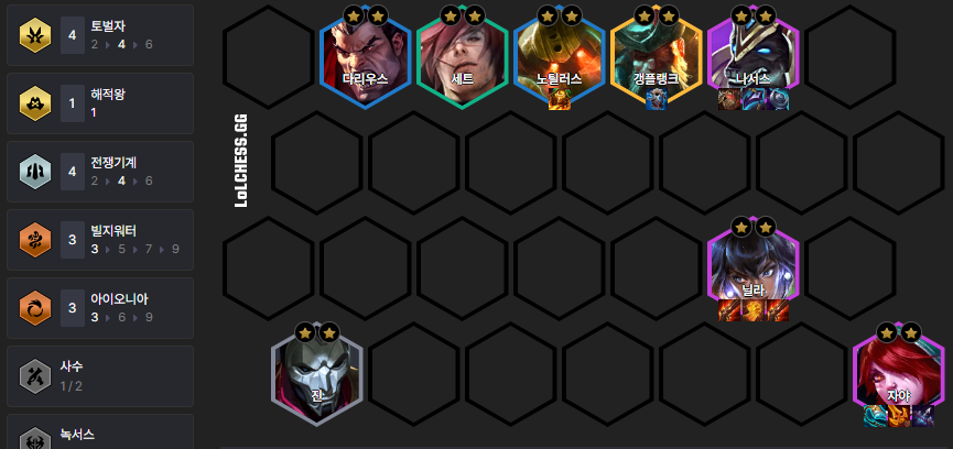 아이템과 기물 상황에 따라 이런 형태의 덱 구성도 가능합니다. 마찬가지로 8레벨에 시너지 표에 맞게 라이즈, 크산테 등을 써주셔도 좋습니다.