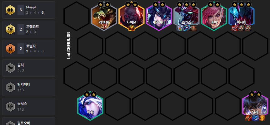 이런 상황에서는 빠르게 8레벨로 가셔서 프렐요드+닐라를 써주셔도 좋습니다. 만약 난동꾼 상징이 있다면 닐라에게 난동꾼 상징을 넣고 7레벨에서 렉사이 3성작을 하면서 마무리하셔도 되고, 상징이 없더라도 닐라를 쓰는 사람이 많이 겹쳤다면 7레벨에 닐라를 찾고 8레벨로 넘어가셔야 합니다.