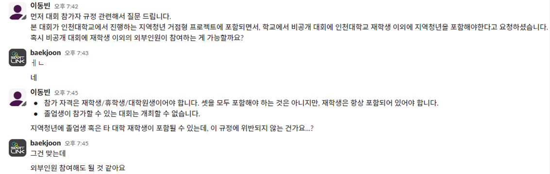 결국 계획안 결재 과정에서 인천대학교 재학생만 모집 받는 것을 지적받았고, 재학생과 지역청년의 비율이 일정 비율을 만족하지 못하면 예산을 받을 수 없다는 절망적인 답변을 들었다... 이 답변을 들은 게 11/6이었는데, 마음이 꺾여버릴 뻔했지만 이미 검수진 모집까지 마친 상황에서 다른 일정을 포기하고 우리 학교에 지원해주신 검수진분들께 대회를 취소하겠다는 말을 차마 할 수는 없었다. 어떻게든 방법을 찾아보기로 하고, Slack에 초대되자마자 양해를 구해보았다.