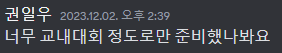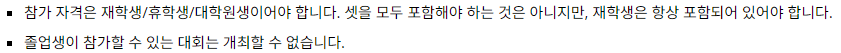 - 지역청년의 대상 범위가 넓어 외부 인원과 재학생의 실력 격차가 크기 때문에, 교내대회의 의미를 잃어버리고 교내 수상자가 아예 없는 상황이 발생할 가능성이 높다. (이게 가장 큰 문제였다.)