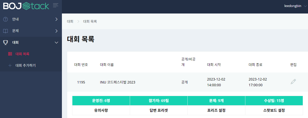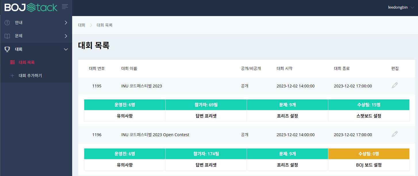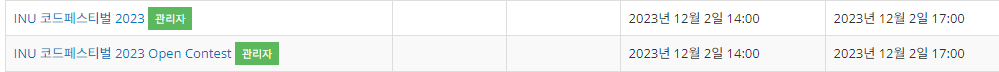 대회 목록에 이렇게 올라오게 된다. (오프라인 대회는 비공개 설정으로 해야 하고, 비공개 대회는 목록에 보이지 않는다. 대회를 마치고 공개로 돌려놓으면 된다.)