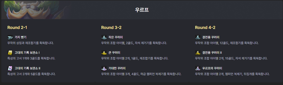 롤토체스 공략 글은, 매 패치마다 메타가 크게 바뀌기 때문에 참고로만 봐주시기 바랍니다. 이 글은 2023/11/03일 기준으로 작성된 글입니다. 이전 글에 이어서, 이번 글은 게임이 시작하는 순간부터 9레벨에 도착할 때까지, 모든 과정에서 반드시 알아야 하는 팁 위주로 소개할 예정입니다. 하나라도 놓치면 스노우볼이 크게 굴러갈 수도 있으니, 놓치지 말고 읽어주세요! 0) 게임 시작 전 먼저 가장 중요한 우르프 전설을 골라줍니다. 그리고 이전 글을 참고하셔서, 가장 하고 싶은 덱의 완성형을 배치툴에 담아놓고 게임을 시작합시다. (상점에 표시된 펭구가 뇌절을 방지해줄 겁니다!) 1) 게임 시작(~ 2-2 라운드) 우선 2-1라운드 전에, 공동 선택과 미니언 라운드가 있습니다. 어쩌면 여기가 게임 전체 중요..
